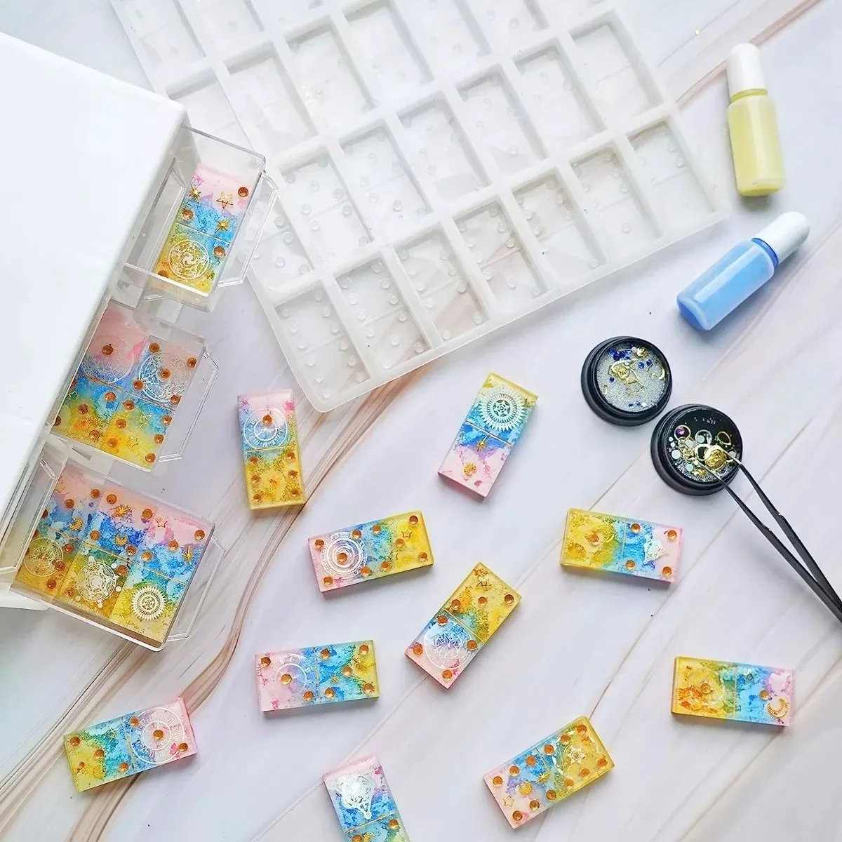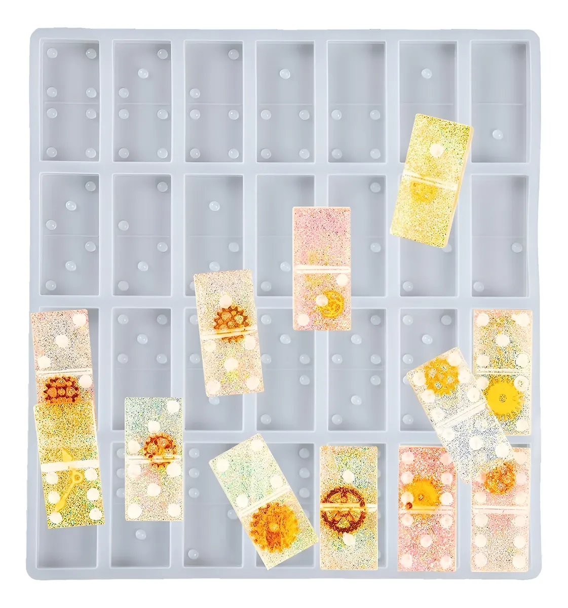 Añade funcionalidad y estilo a tus proyectos creativos con este molde de silicona para fichas de dominó, compatible con resina epóxica y UV. Perfecto para manualidades educativas, decoración artesanal o crear piezas únicas.